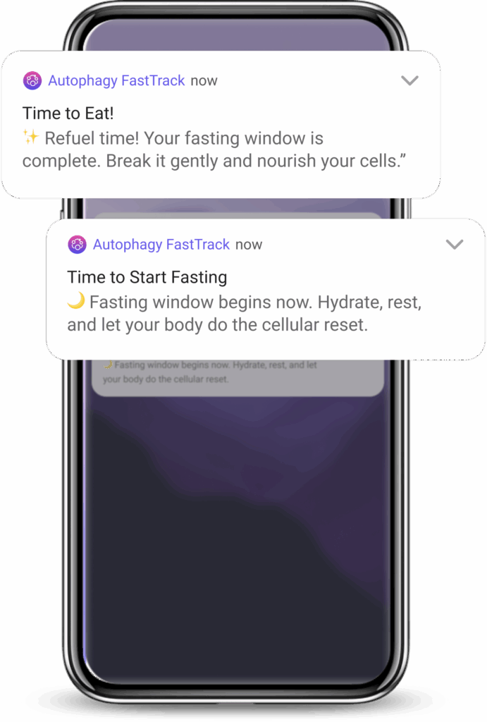 Each reminder is designed to keep you aligned with your goals—encouraging hydration, rest, and mindful eating. Whether it’s time to start fasting or time to break your fast, you’ll always have a gentle nudge to support your journey toward better health and cellular renewal.